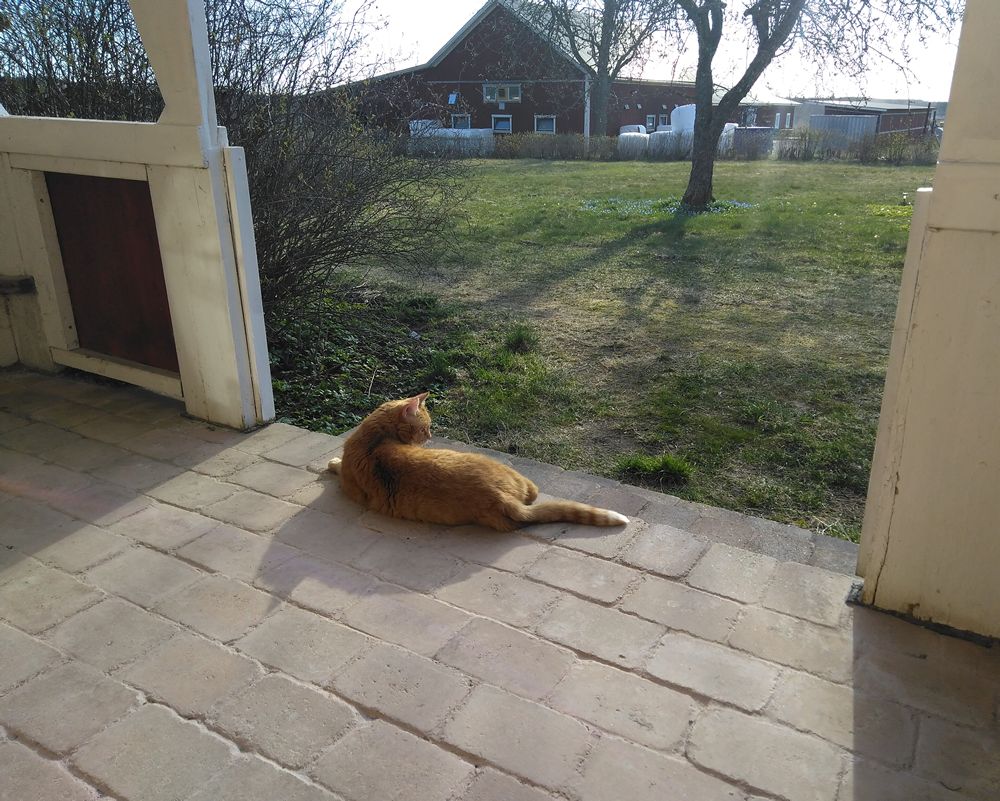 När vi var i Norrland och det regnade så han fick han sitta på trappan och kolla läget. Han