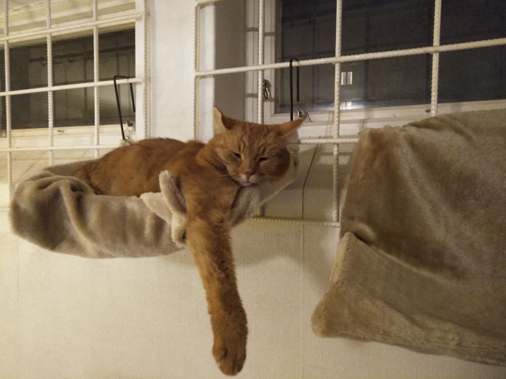 Han gillade också att sitta på hyllan vid kattluckan och se sig omkring och lyssna efter överflödiga möss att samla in.